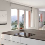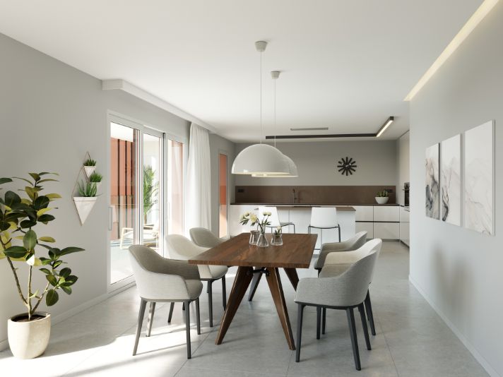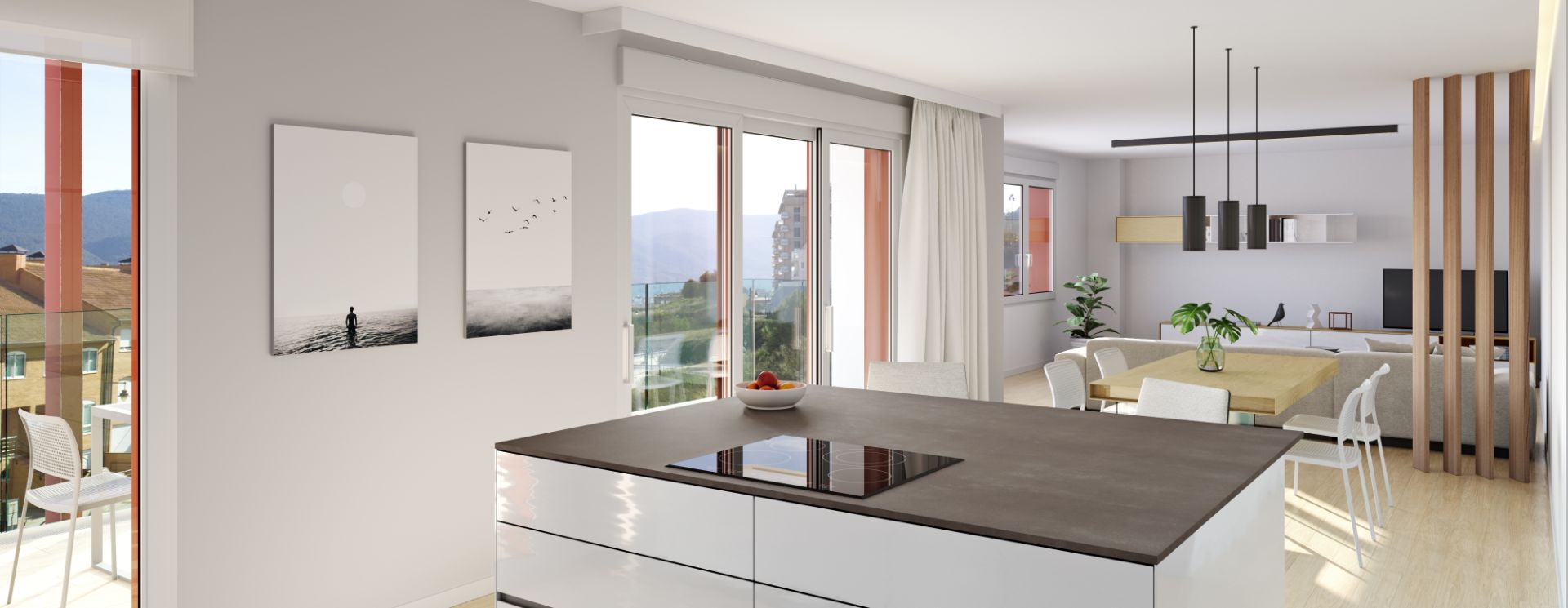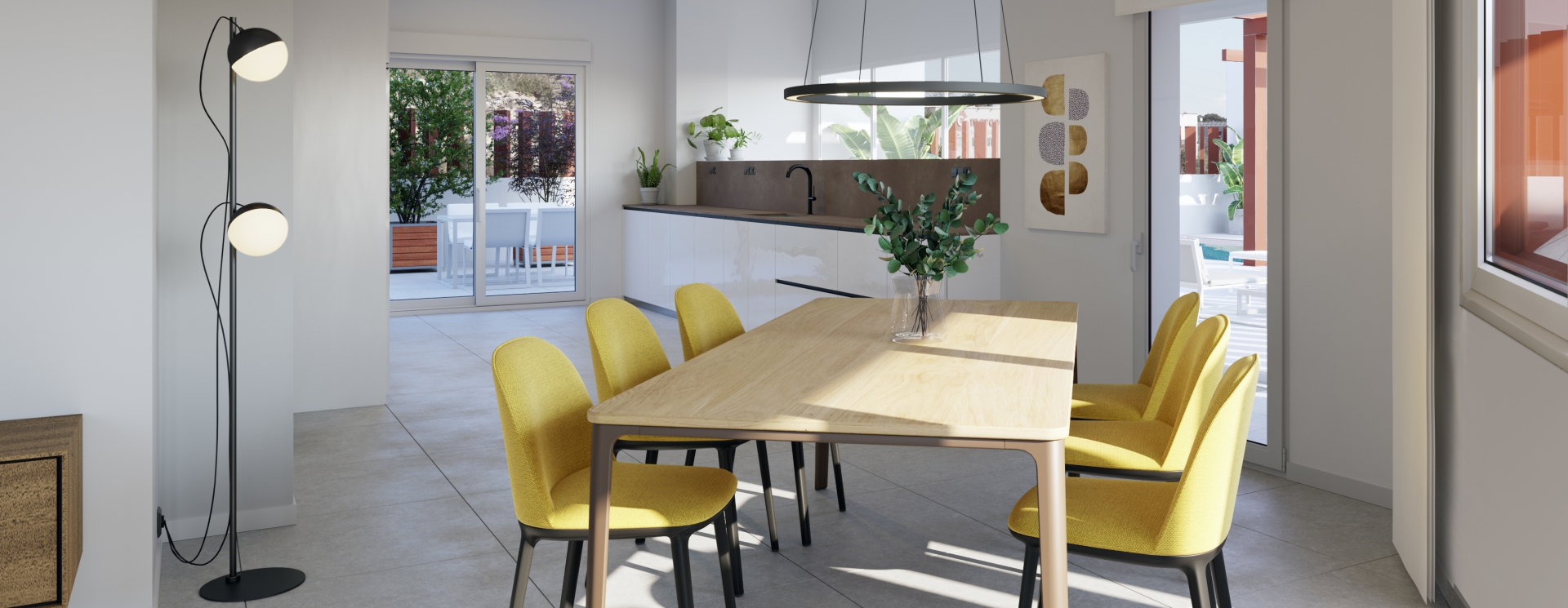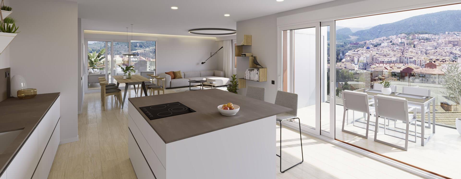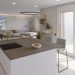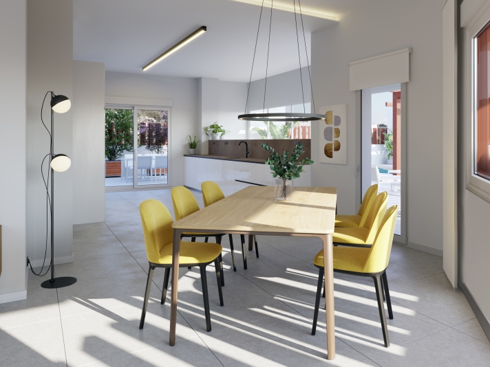 La zona de día de las viviendas ODINA HOMES es un amplio salón, comedor, cocina que comunica directamente con una terraza de grandes dimensiones.