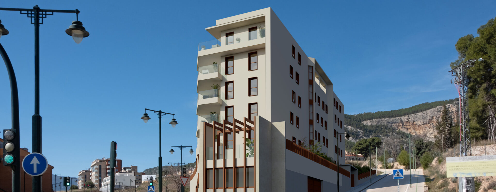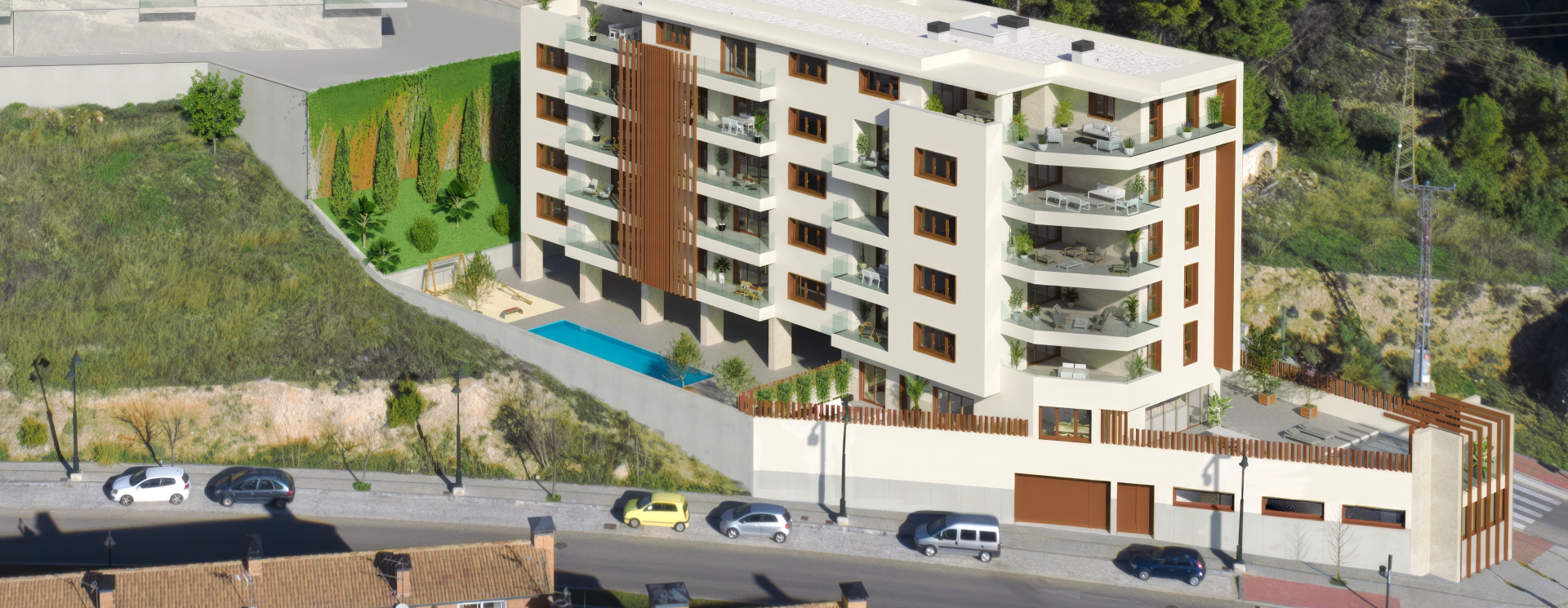 Vivir en ODINA HOMES te permitirá disfrutar de amplias terrazas con espectaculares vistas sobre Alcoy, zonas comunes con juegos infantiles, piscina, vestuarios y amplias zonas de urbanización privada.